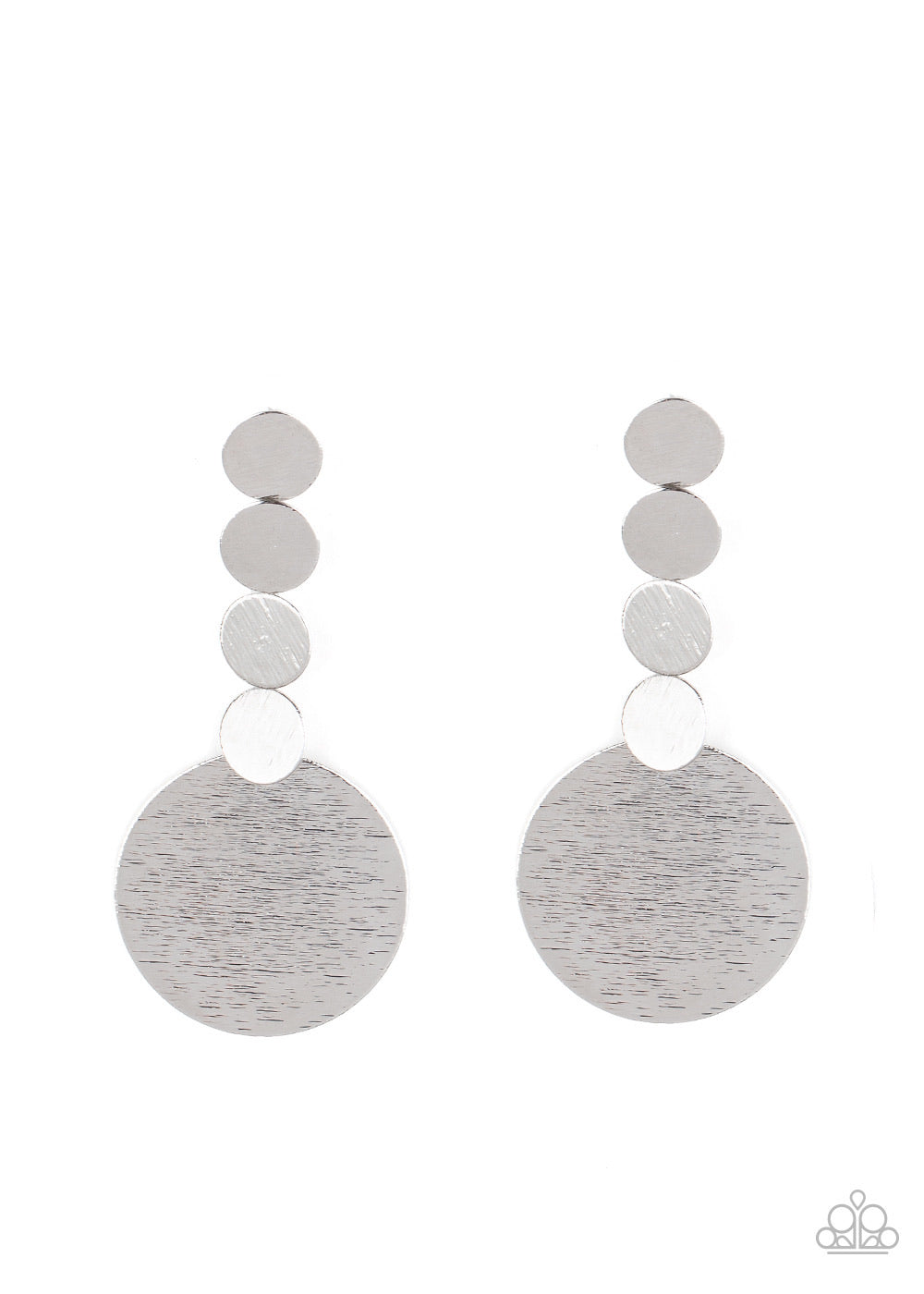 Featuring a delicately scratched surface, a row of dainty silver discs connects to a large silver disc, creating a bold display. Earring attaches to a standard post fitting.