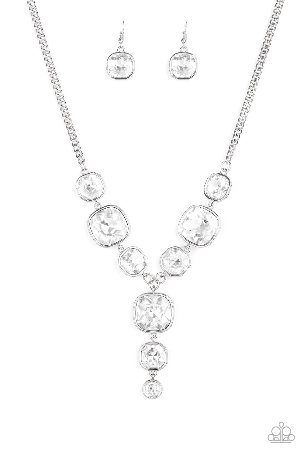 Featuring sleek silver frames, a dramatic collection of white gems cascade from the bottom thick silver chain. Additional gems trickle from the center, creating a glamorous extended pendant below the collar. Features an adjustable clasp closure.