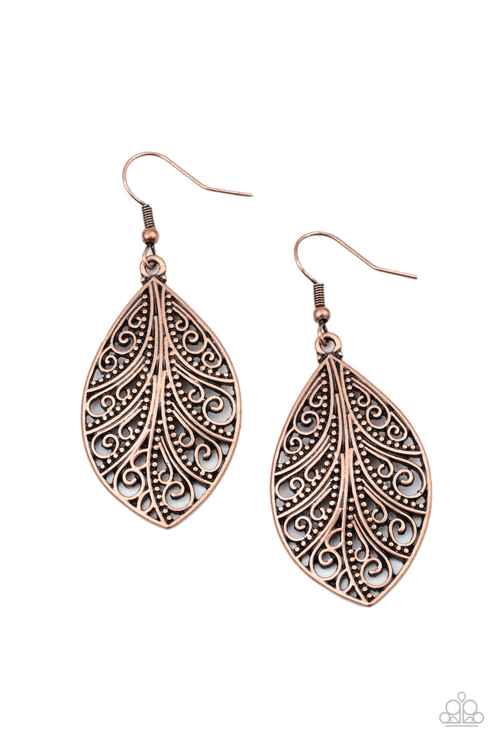 Smooth and studded vine-like filigree swirls across the front of a copper frame, creating a whimsical piece. Earring attaches to a standard fishhook fitting.