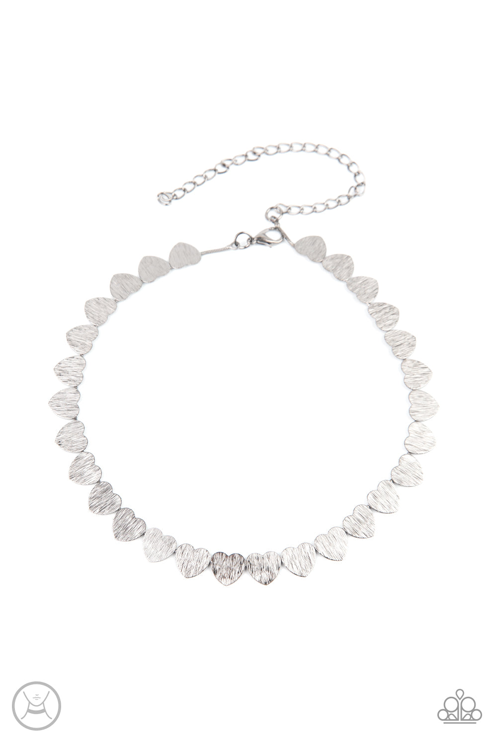 Featuring a shimmery scratch finish, a dainty collection of silver heart frames delicately connect around the neck for a flirtatious look. Features an adjustable clasp closure.