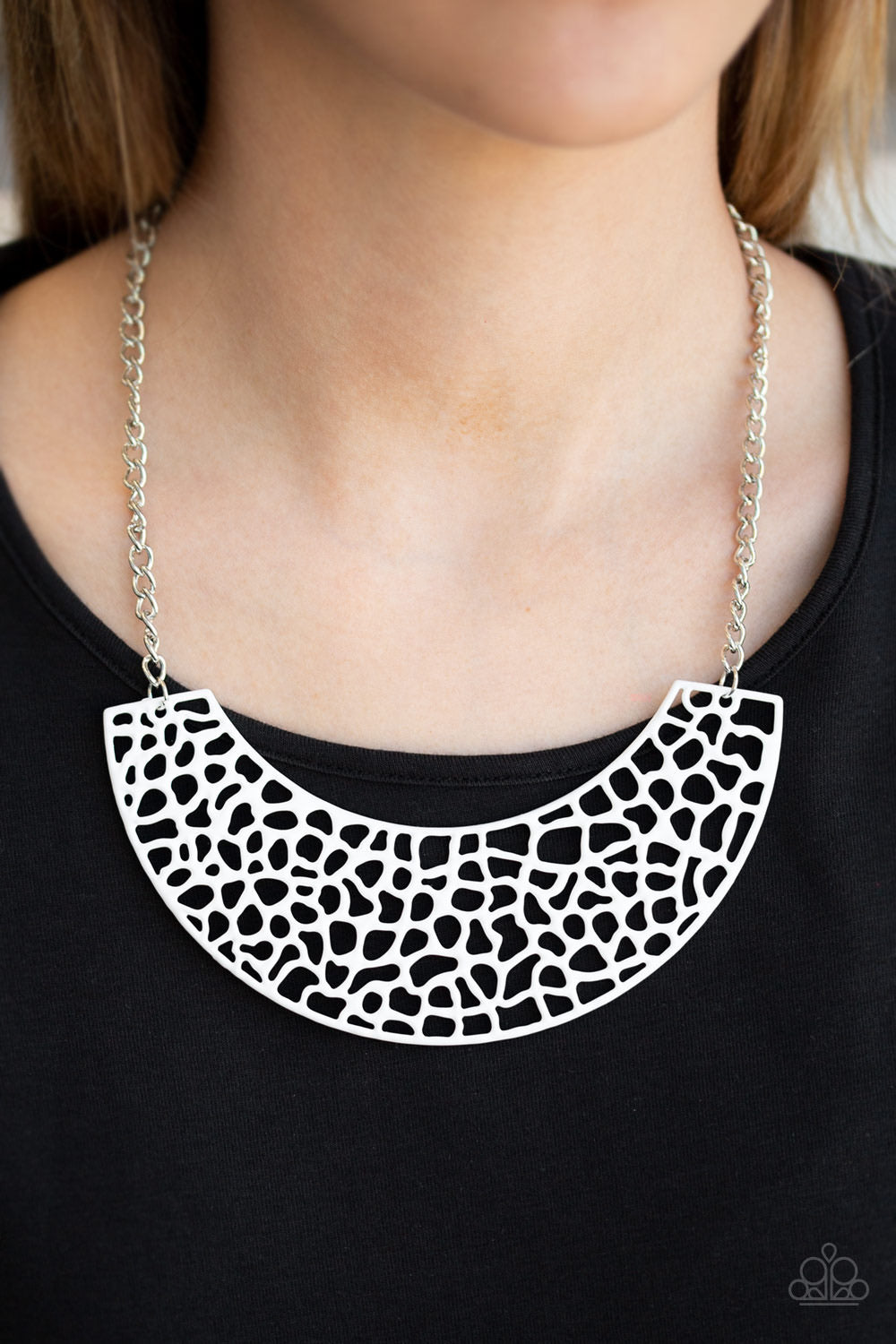 A large crescent shaped pendant is brushed in a brilliant white finish, creating a bold statement piece that lays along the collar as it swings from a shiny silver chain. Features an adjustable clasp closure.