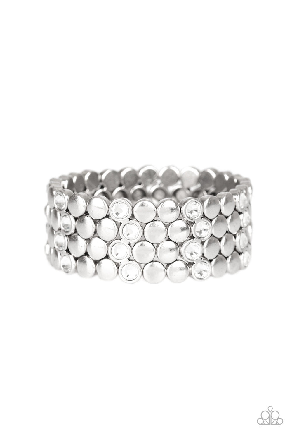 A collection of frames featuring flat silver studs and glittery white rhinestones are threaded along a stretchy band, scattering sparkle across the wrist.
