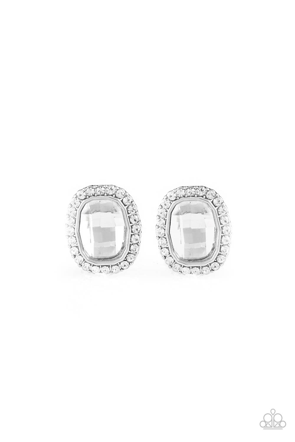 A faceted white gem is pressed into a shimmery silver frame radiating with glassy white rhinestones for a timeless fashion. Earring attaches to a standard post fitting.